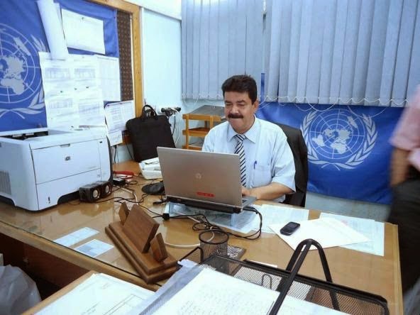 Este é al-Hattab em seu escritório -- decorado com duas grandes bandeiras da ONU: